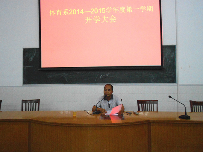 新学期,新气象。2014年9月2日晚上19:30分体育系在学院师训楼218室召开2014―2015学年度第一学期开学大会。出席本次会议有体育系书记梁泳文同志、辅导员陈世红、吴铿劲、陈月老师,各班班主任以及312、313级全体学生。