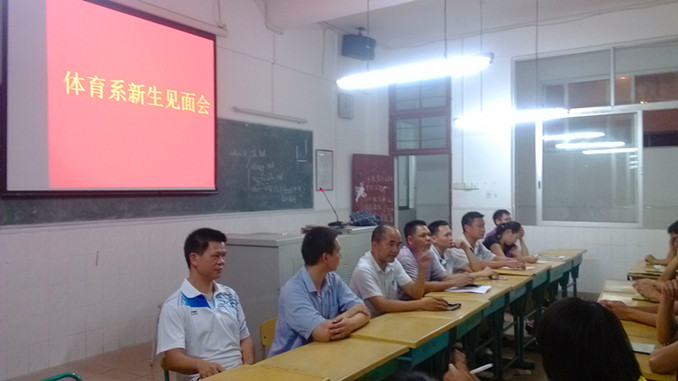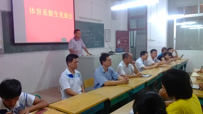 会议由陈世红老师主持,一共分三个议程:一是由体育系支部梁泳文书记致欢迎辞,他首先对今年报到的97位新生表示热烈的欢迎和祝贺,同时感谢新生家长们对体育系的信任。然后介绍了体育系的教育管理机构和该系2014届毕业生的就业情况,为同学们就读体育专业树立了信心。最后勉励同学们放眼未来志存高远,立足当下刻苦拼搏,争做一名优秀的体育生;二是由体育主任黄国良同志向同学们介绍了体育系的历史及发展状况,并为同学们在专业学习以及未来发展等问题提出了意见。三是由现场的领导回答同学们的提问,如专插本、自学考试、应征入伍、勤工俭学和专业证书考核等。