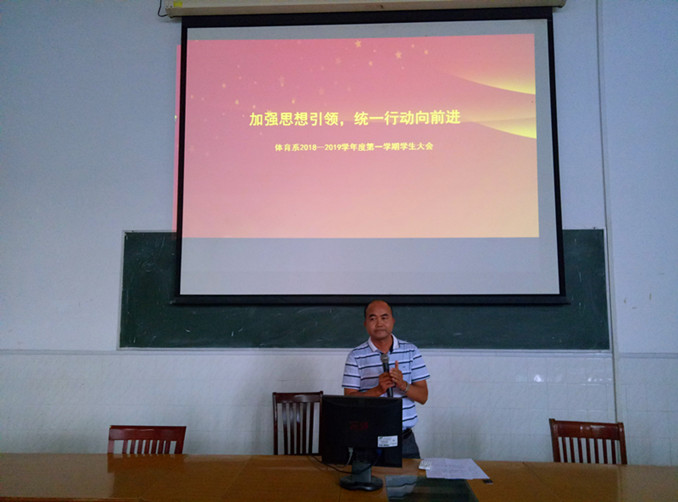 2018年9月6日下午4:15,体育系在高州校区师训楼218室召开了2018―2019学年度第一学期学生大会,参会的有体育系辅导员黄海林、吴铿劲老师及各班的班主任。