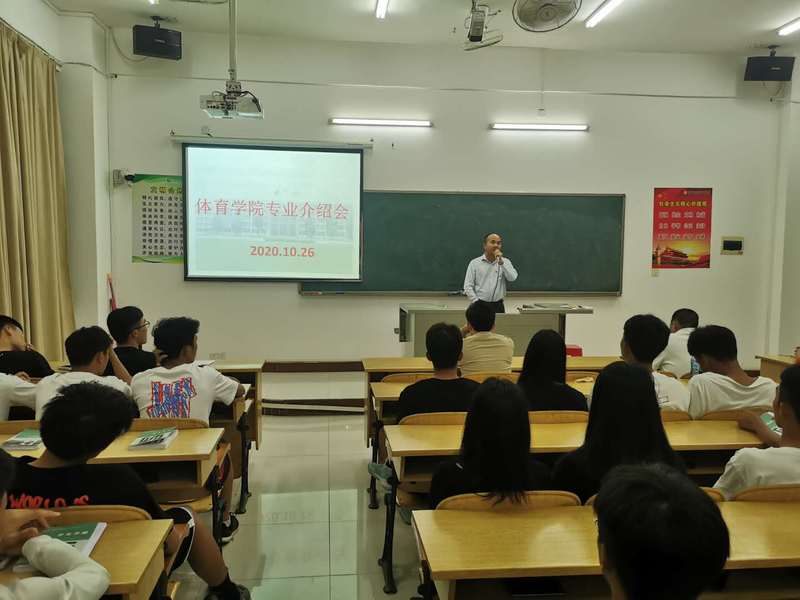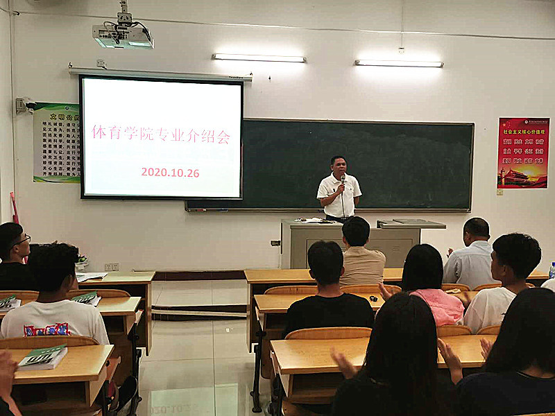 金秋九月,秋高气爽。时值我校2020级新生进行入学教育之际,体育学院于10月26日晚上在茂名校区荟文楼②221室召开新生专业介绍会。会议由体育系党支部书记梁泳文主持,体育学院黄国良院长、学院辅导员和新生班主任出席了本次大会。