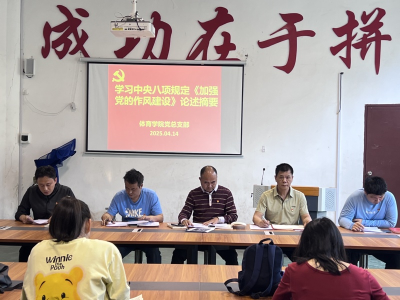 2025年4月14日下午,体育学院党总支在茂名校区体育馆人体科学实验室召开深入贯彻中央八项规定精神学习教育推进会。学院党总支书记、院长梁泳文,学院党总支副书记、副院长莫涛,学院第一党支部书记卢帮,学院第二党支部书记陈海滨出席会议,全体党员同志参加会议。会议由学院党总支纪检委员郑剑飞主持。